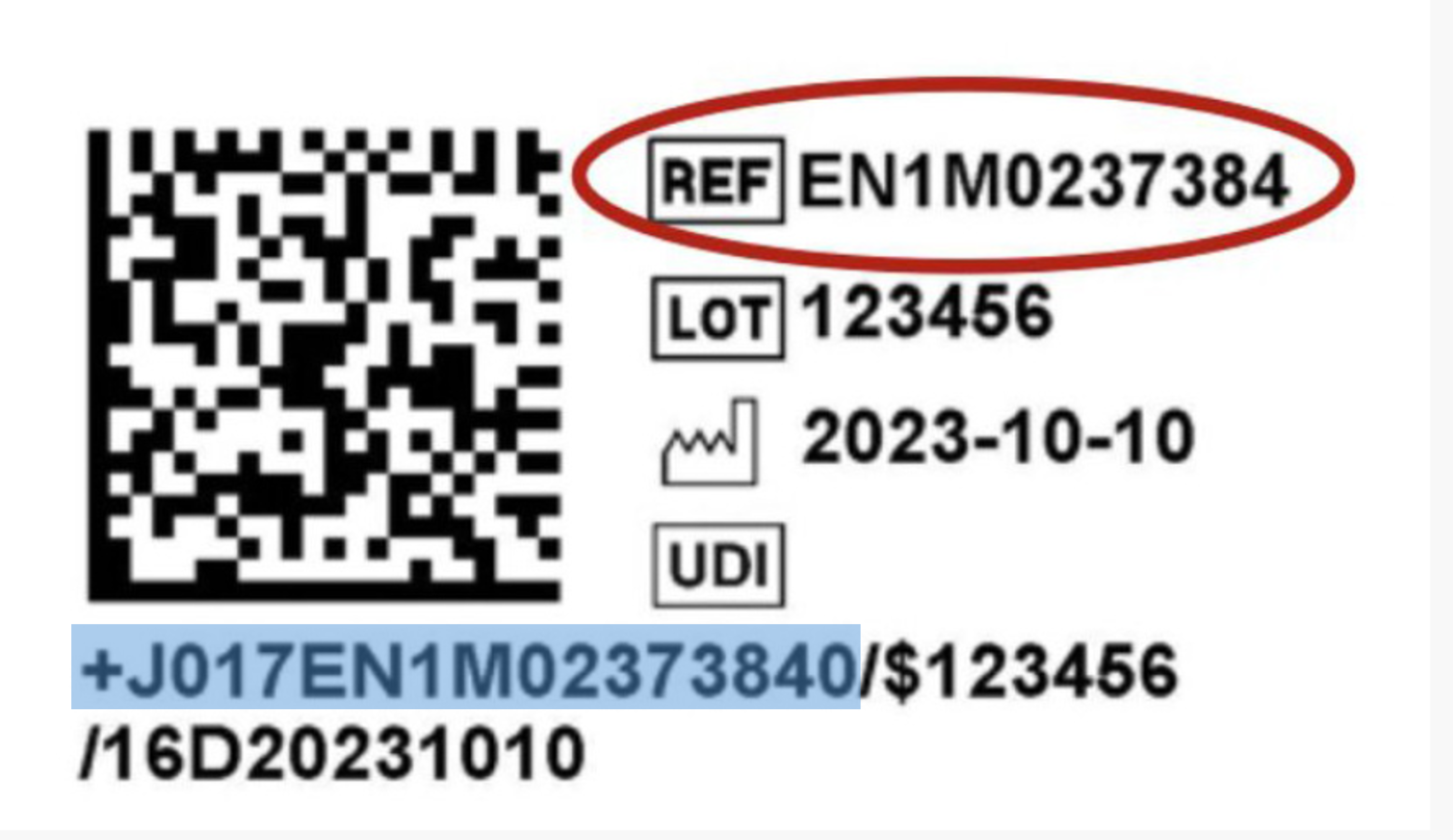 Die REF finden Sie auf dem Produktetikett abgebildet; ebenso wie den HIBC als Klarschrift unter dem Datamatrixcode. Bitte geben Sie für den HIBC nur den blau markierten Teil der Klarschrift in das Suchfeld ein.